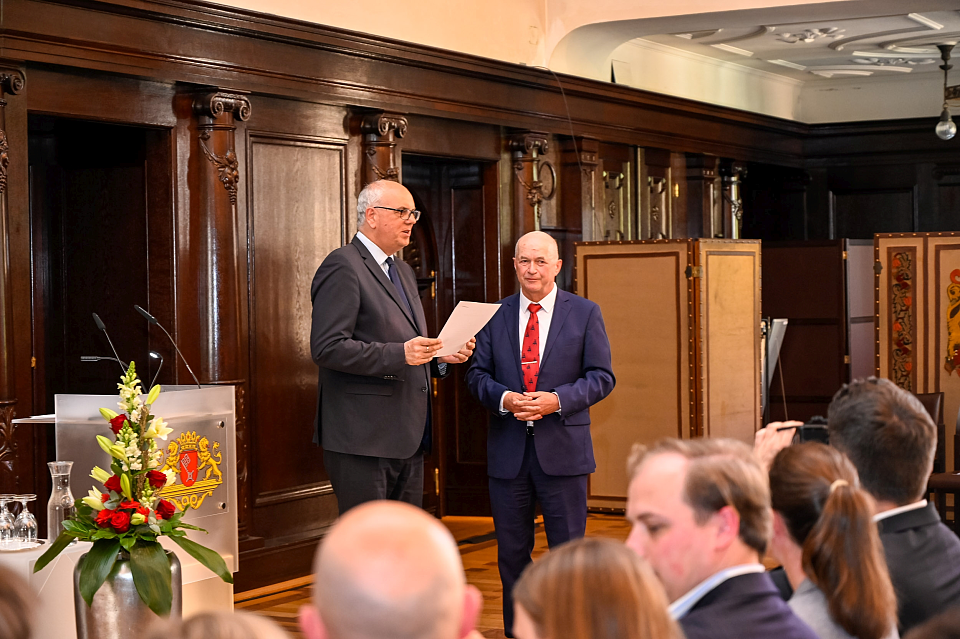 Bürgermeister Dr. Andreas Bovenschulte verabschiedet Prof. Dr. Georg Skalecki feierlich mit der Urkunde zur Versetzung in den Ruhestand.