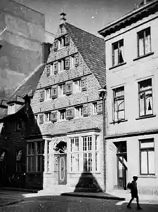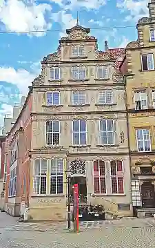 Das historische Bauwerk mit Weserrenaissance-Fassade war eines der wenigen Wohnhäuser aus dem 17. Jh. (um 1625), das nach den Bombenangriffen des Zweiten Weltkriegs in diesem Quartier weitgehend unbeschadet blieb. Der historische Bestand besteht nur noch aus der Fassade, dennoch steht das gesamte Gebäude unter Denkmalschutz. Das Giebelhaus hat zur Straßenseite zwei symmetrisch angeordnete Ausluchten, die 1730 hinzugefügt wurden. Zwischen ihnen sitzt das Portal aus Sandstein. Dessen Gewände und Laibungen werden von Kartuschen (Zierrahmen) und hängendem Ornament im Relief geschmückt. Engel- und Löwenköpfe zieren die Halbkreisarchivolte über der Tür.