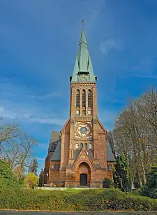 Ursprünglich eine dreischiffige neugotische Backstein-Hallenkirche mit prachtvollem Maßwerk-Turmhelm nach Freiburger Vorbild, 1853–1855 von Simon Loschen errichtet. Die Kirche wurde im Zweiten Weltkrieg 1944 stark beschädigt; Turm und Teile der Außenwände blieben jedoch erhalten. Bei der Wiederherstellung wurde das Äußere taktvoll dem ursprünglichen Eindruck angepasst. Förderprojekt der Deutschen Stiftung Denkmalschutz.